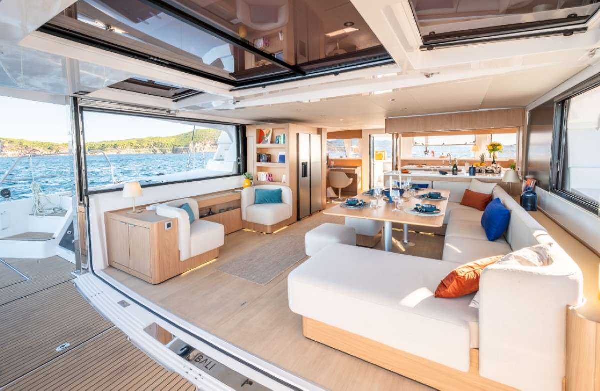 At its heart lies the iconic Bali “garage door”—a full-width aft wall that lifts to merge the grand salon with the cockpit in one sweeping gesture. This instantly transforms the interior into a vast, open space that’s perfect for dining with family or celebrating with friends, always framed by spectacular views. As you walk on the teak deck, you’ll feel the comfort of thoughtfulness and luxury with every step.
