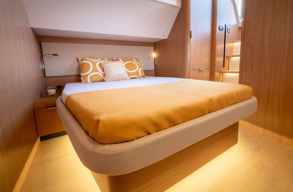 Below deck, the primary suite offers a king bed, a generous ensuite bath, and the rare luxury of dual private entrances—to the salon above and to the beach club outside. Three additional queen staterooms, each with an ensuite bath and walk-around beds, ensure that every guest enjoys hotel-level comfort and privacy. All cabins feature air conditioning.