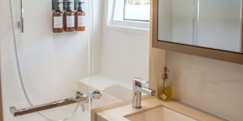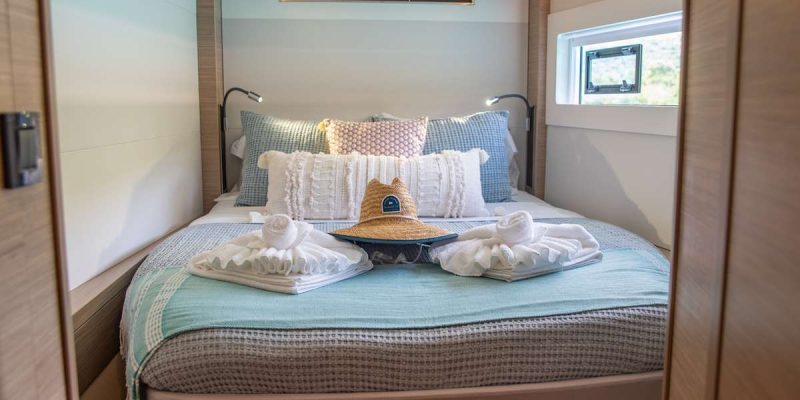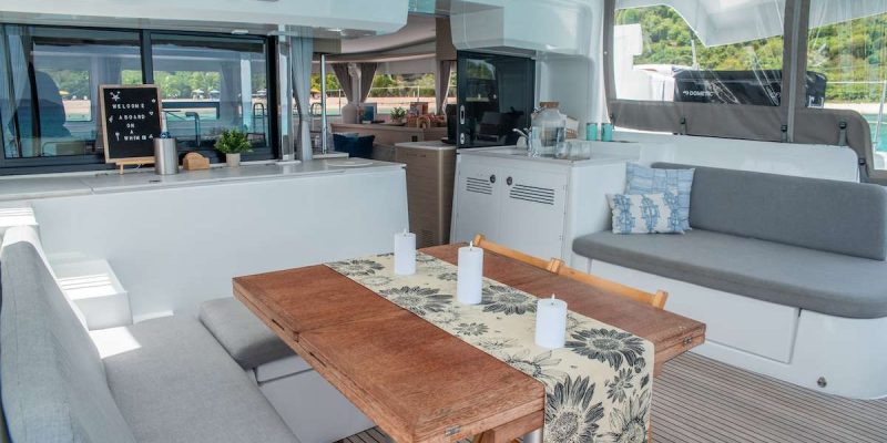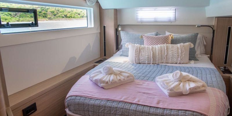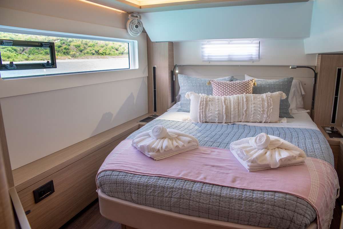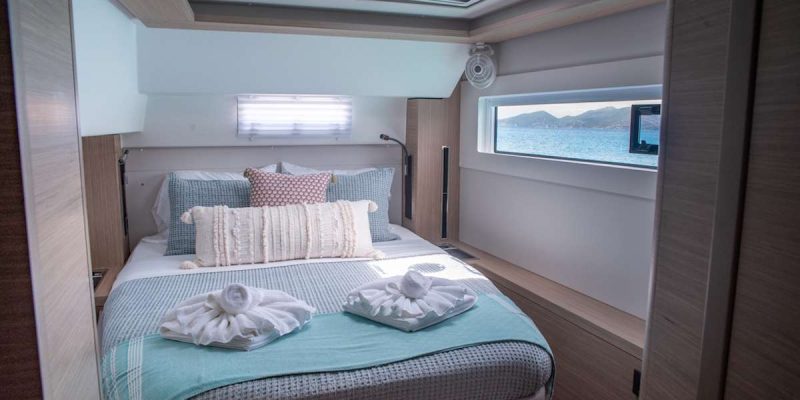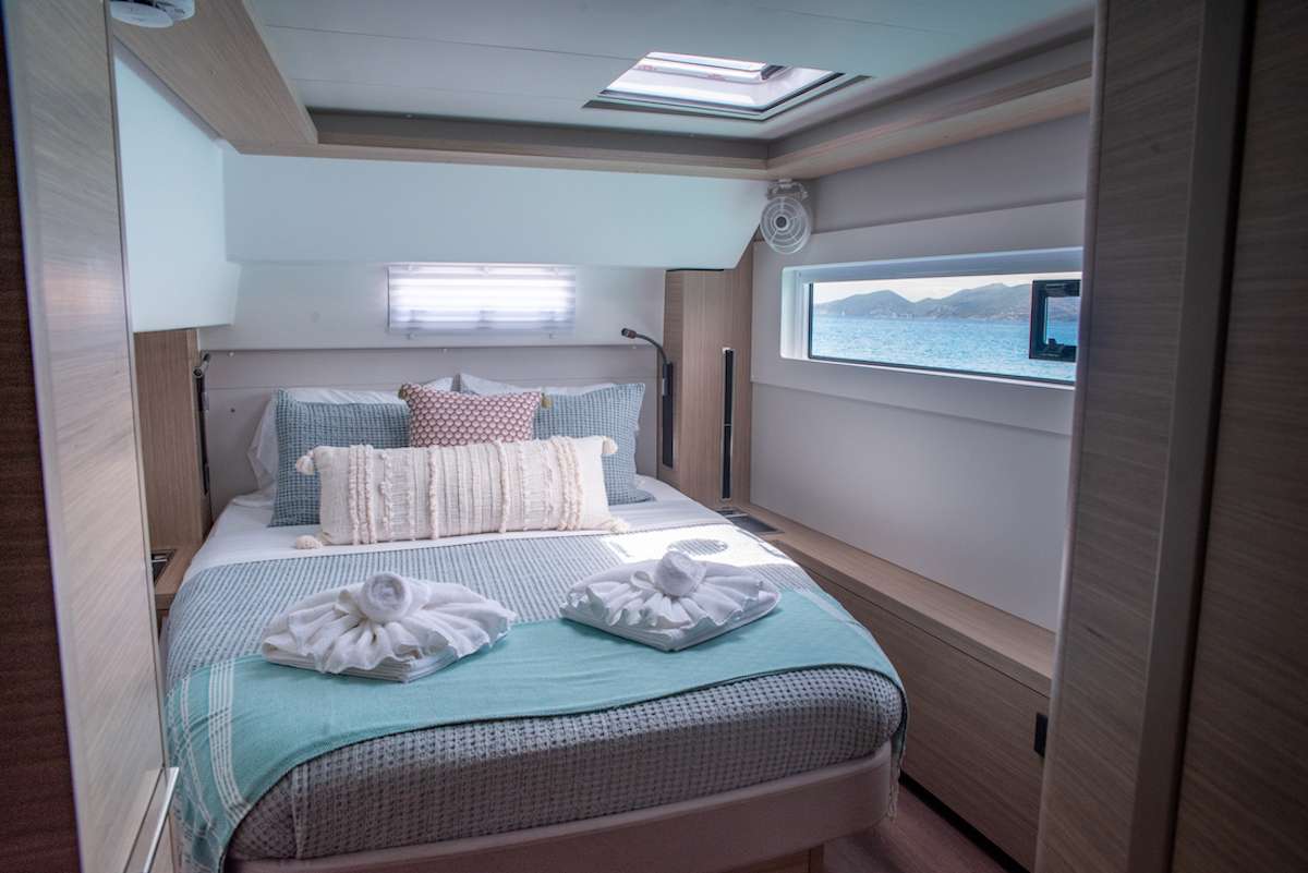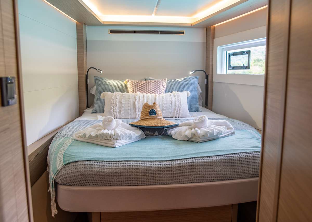 The yacht accommodates up to 6 guests in three spacious queen cabins, each with its own private en-suite bathroom, providing comfort and privacy for everyone on board. The bright and inviting salon features a contemporary design with plenty of natural light. A comfortable U-shaped sofa creates the perfect place to relax with a morning coffee while the onboard chef prepares breakfast in the well-appointed galley.