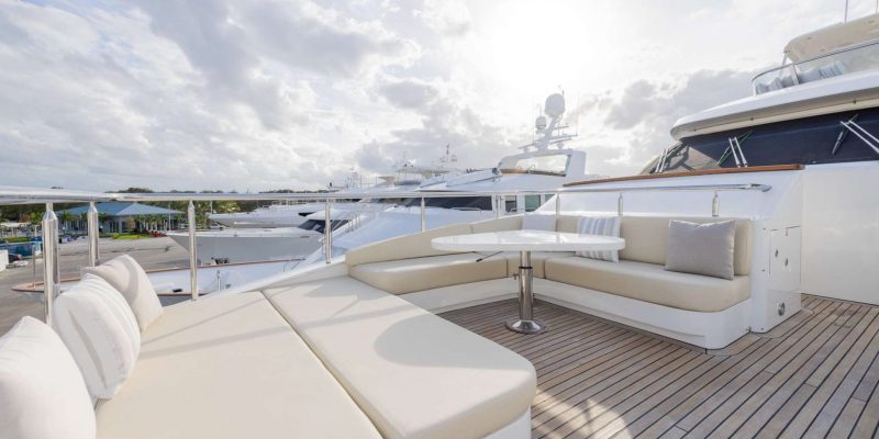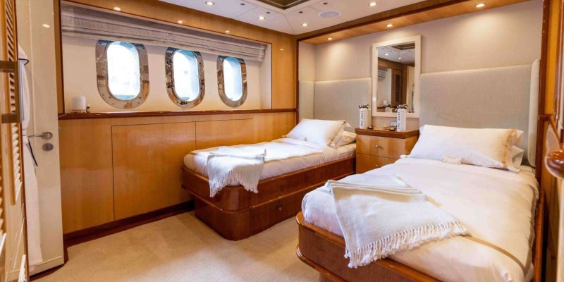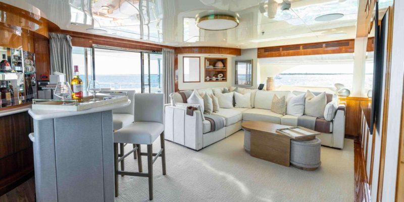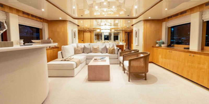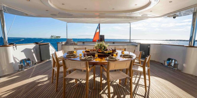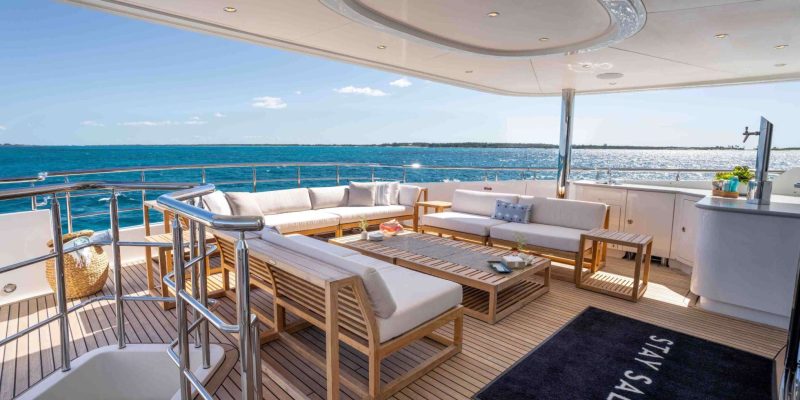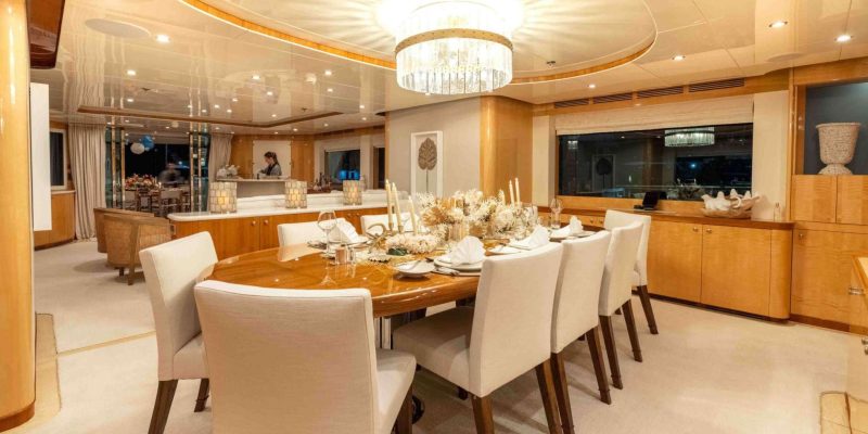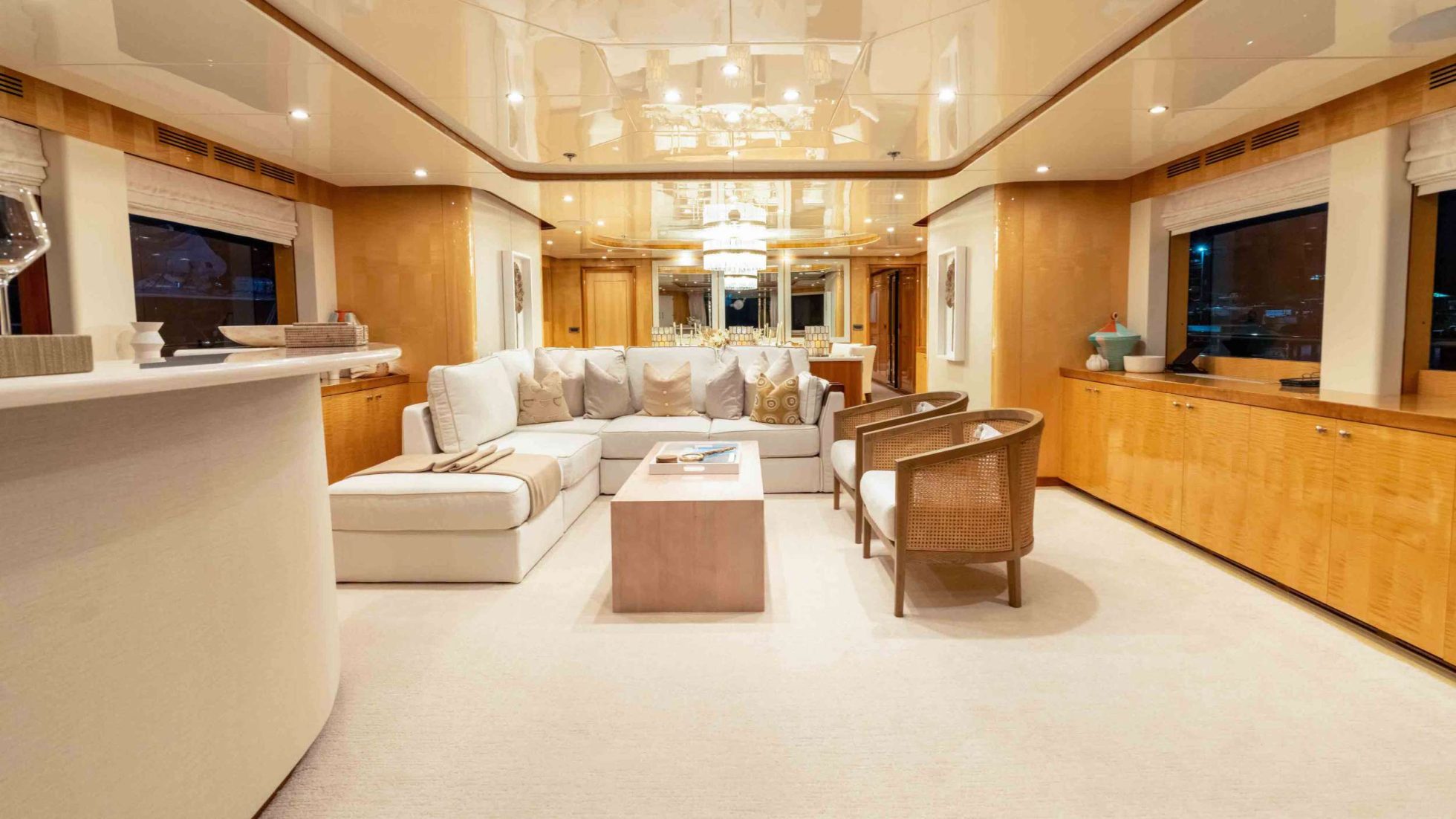 Her expansive deck areas provide the perfect setting for relaxation and socializing. The main aft deck features a shaded dining table for 12, a barbecue, and a widescreen TV. The upper deck offers a comfortable lounge area ideal for morning coffee or sunset cocktails, while the sundeck boasts spectacular views with sun loungers, a bar, lounge seating, and an alfresco dining space.