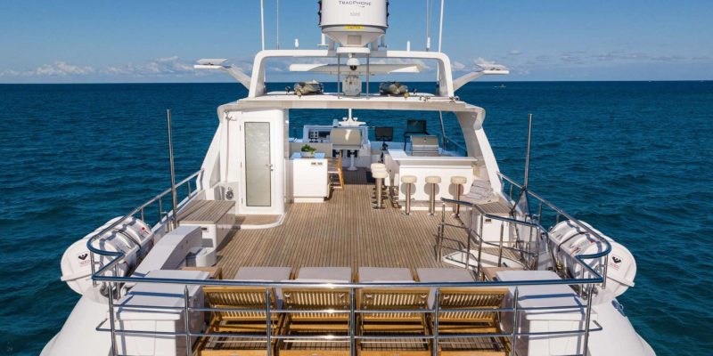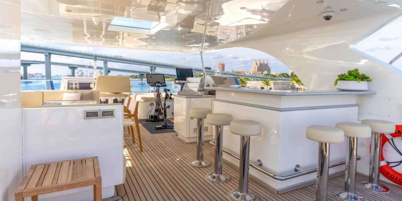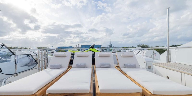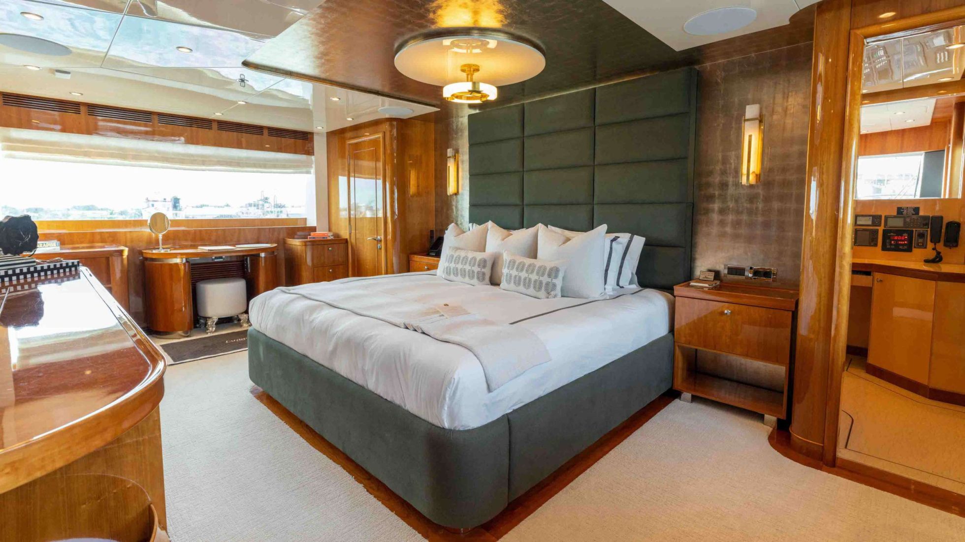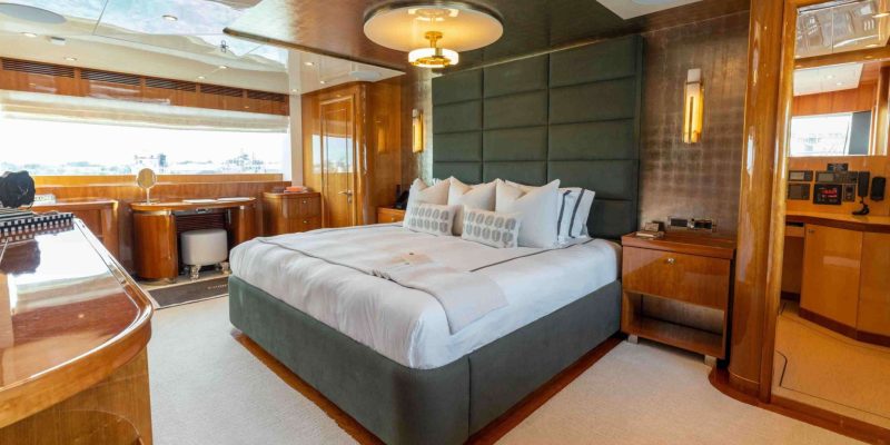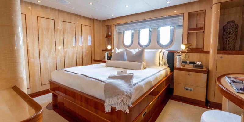 Stay Salty accommodates up to 12 guests in 6 beautifully appointed staterooms. The master suite is located on the upper deck and features a private lounge, a spacious his-and-hers ensuite bathroom with a jacuzzi tub, and a walk-in dressing room. A VIP stateroom is positioned on the main deck, while the lower deck hosts four additional guest cabins, including one king suite, two convertible twin cabins, and one twin cabin. Each stateroom includes a private ensuite shower room and access to the yacht’s entertainment system.