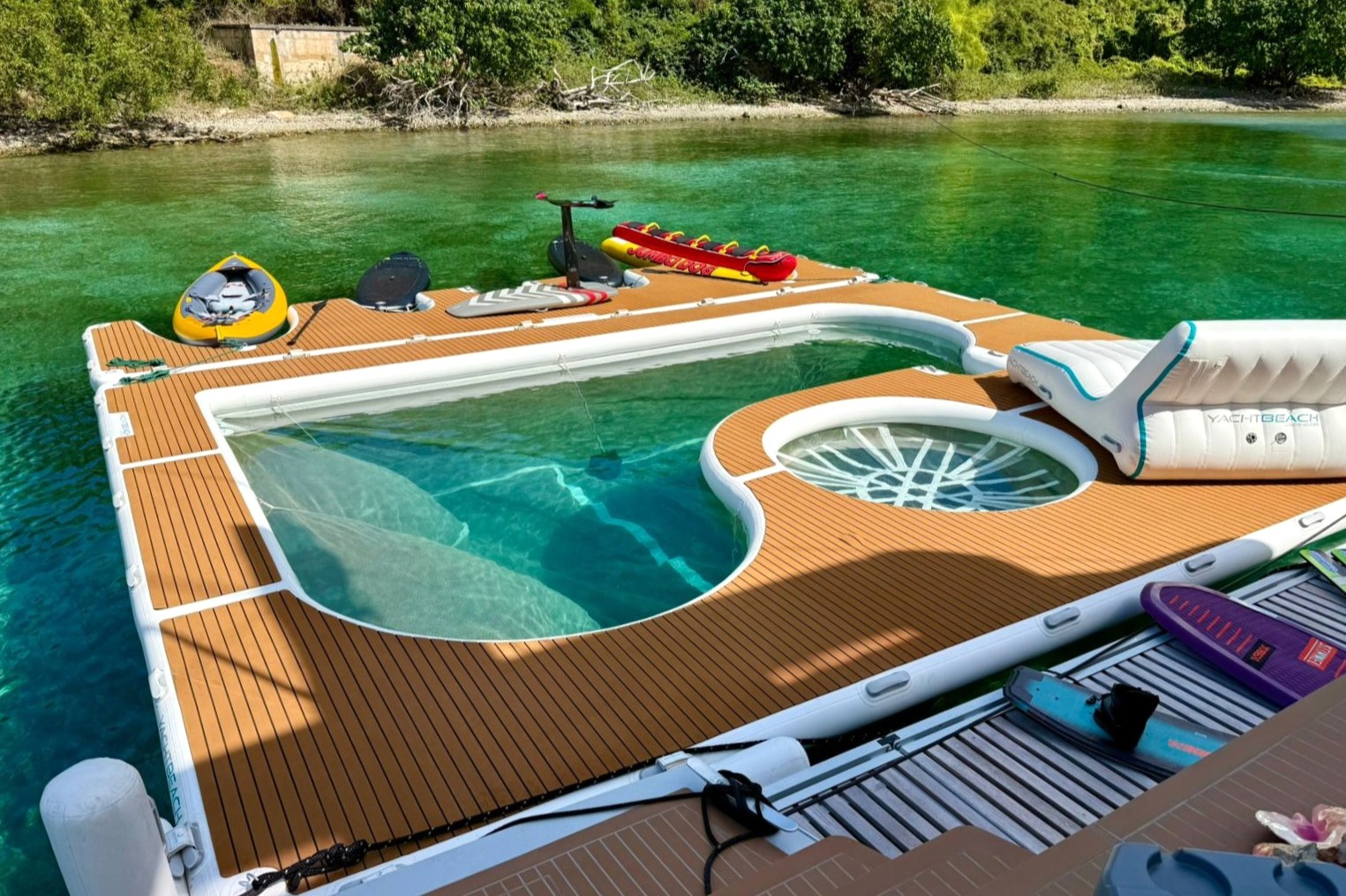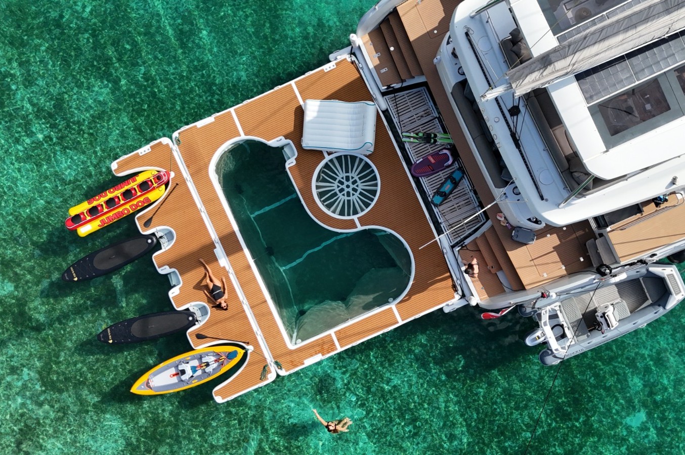 Tri Wing Endor features expansive living areas designed for relaxation and entertainment. The yacht boasts a large inflatable aquatic zone that transforms any anchorage into a private floating resort, perfect for watersports and family fun. Guests can also enjoy a wide range of activities including water skiing, wakeboarding, paddleboarding, and snorkeling.